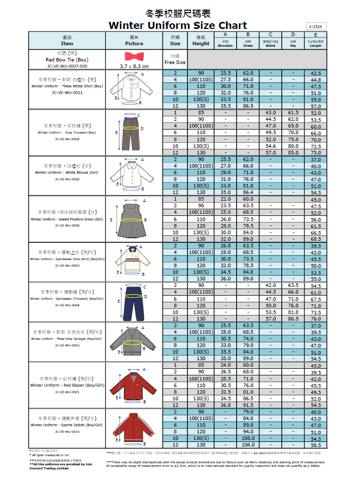 冬季校服尺寸表